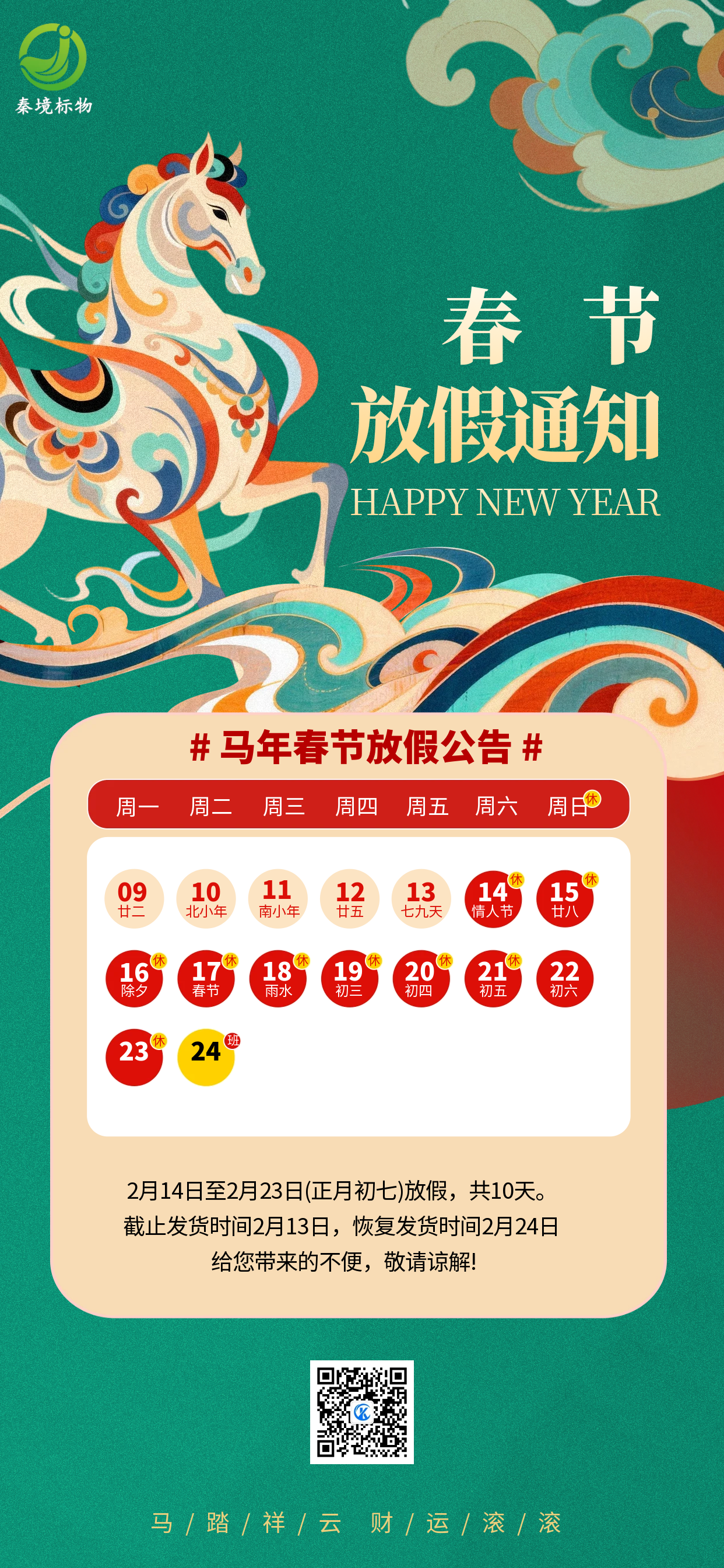 岁序更替,华章日新;金马迎春,福启新元。值此2026年春节来临之际,秦境标物全体员工,向长期以来信任我们、支持我们的客户伙伴、行业同仁,致以最诚挚的新春问候和最美好的节日祝福!感恩一路同行,携手共赴新篇。
